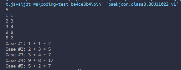 String result = "Case #" + x + ": "+ A + " + " + B + " = " + (A+B);