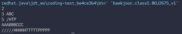 내용: 테스트 개수 만큼 입력 값을 받을 수 있음. 입력 값은 2개 공백 기준으로 입력 됨. 입력 값의 첫번째는 숫자, 두번째는 문자열임. 문자열의 문자당 첫번째 숫자만큼 반복하여 출력하기.