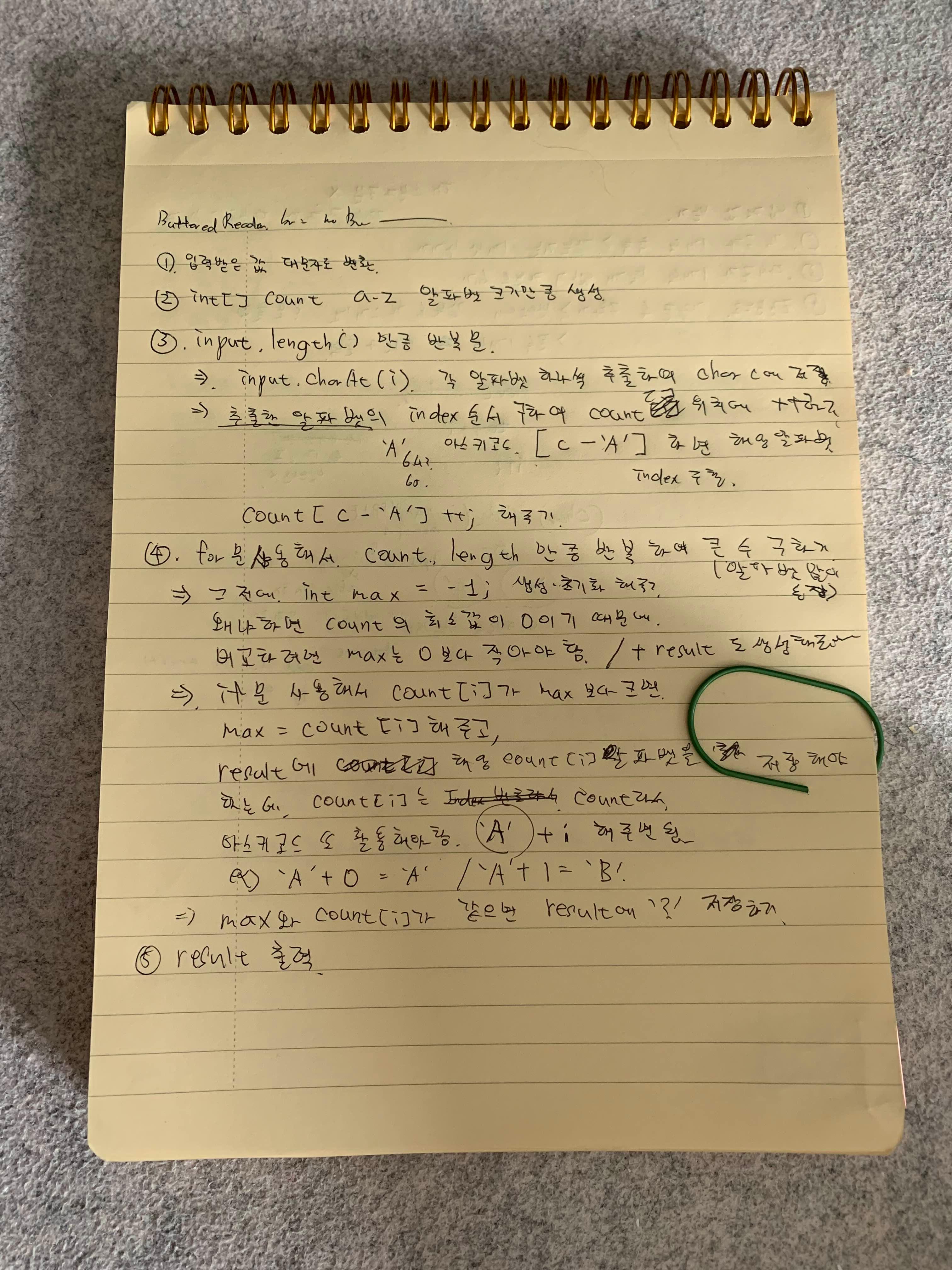 - : if문 사용하여 count[i]가 max보다 크면 max에 count[i] 저장하고 result에 count[i]의 자리의 알파벳을 구해야하는데 아스키코드를 활용하여 구하기