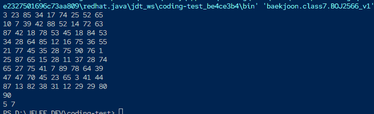 그리고 if문을 사용하여 numArr[i][j]가 max보다 크면 max에 numArr[i][j]를 저장하고 i와 j를 nums에 0번째, 1번째에 값을 저장.
