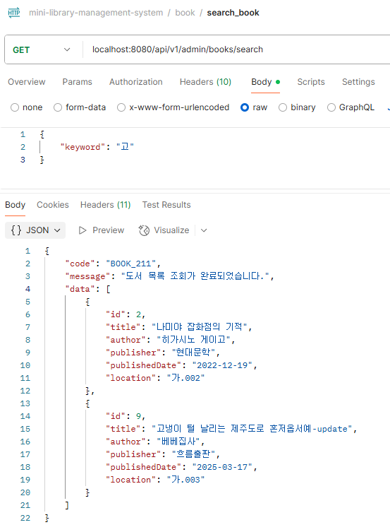 - searchBookByKeyword 메서드를 생성하고 String keyword를 받는다.