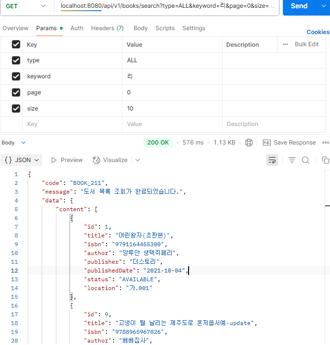 - GET 방식으로 /api/v1/books/search 로 RequestParam형태로 type, keyword, page, size 로 데이터를 요청한다.