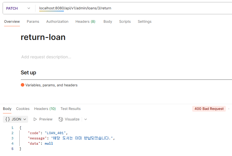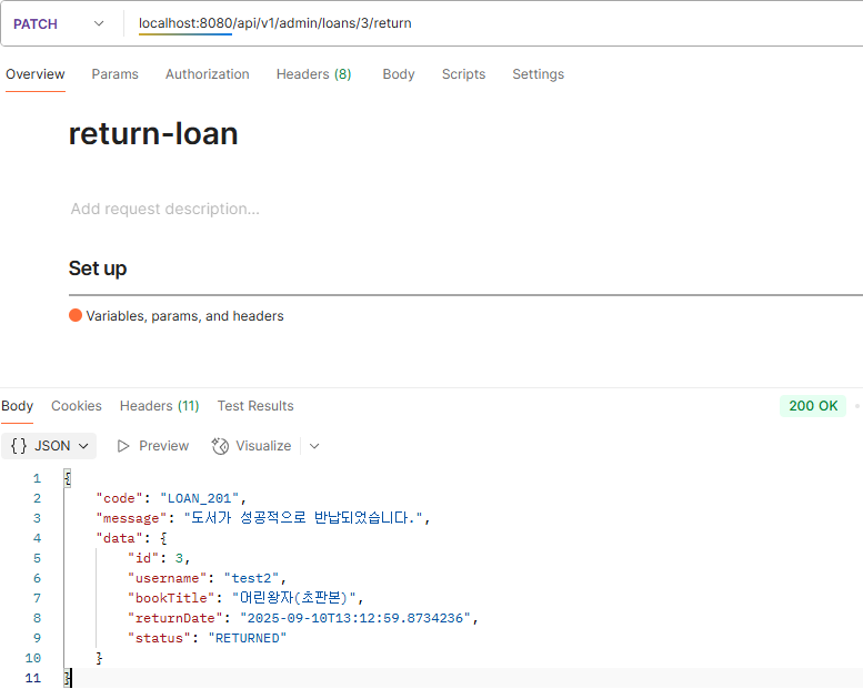 - PATCH /api/v1/admin/loans/{loanId}/return 형식의 요청을 처리한다.