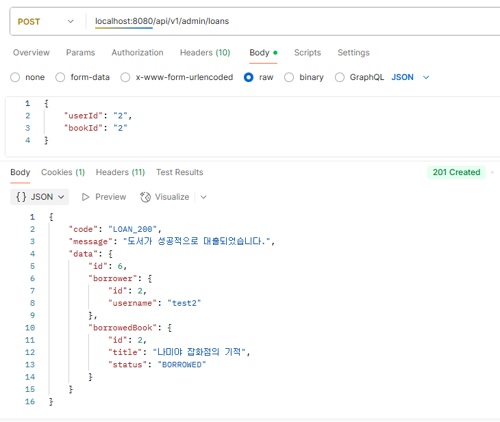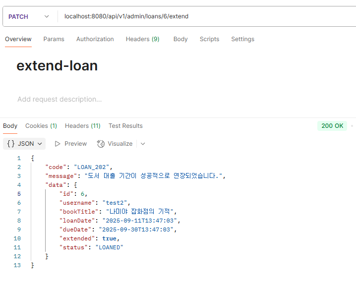 - Service 계층으로 loanId를 전달하여 도서 대출 연장 로직을 처리하고, 결과를 AdminLoanExtendedResDTO 형태로 저장한다.