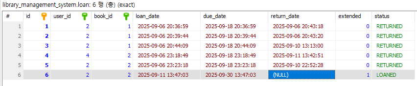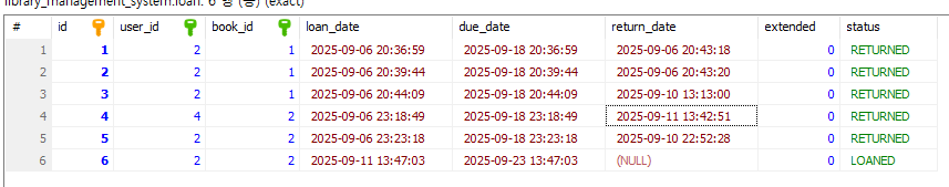 - id, username, bookTitle, loanDate, dueDate, extended, status 필드