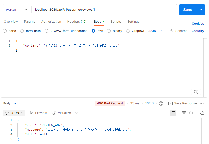 - 로그인한 사용자와 책 리뷰의 작성자가 일치하지 않는 경우 ReviewErrorCode.REVIEW_USER_NOT_SAME 예외를 던집니다.