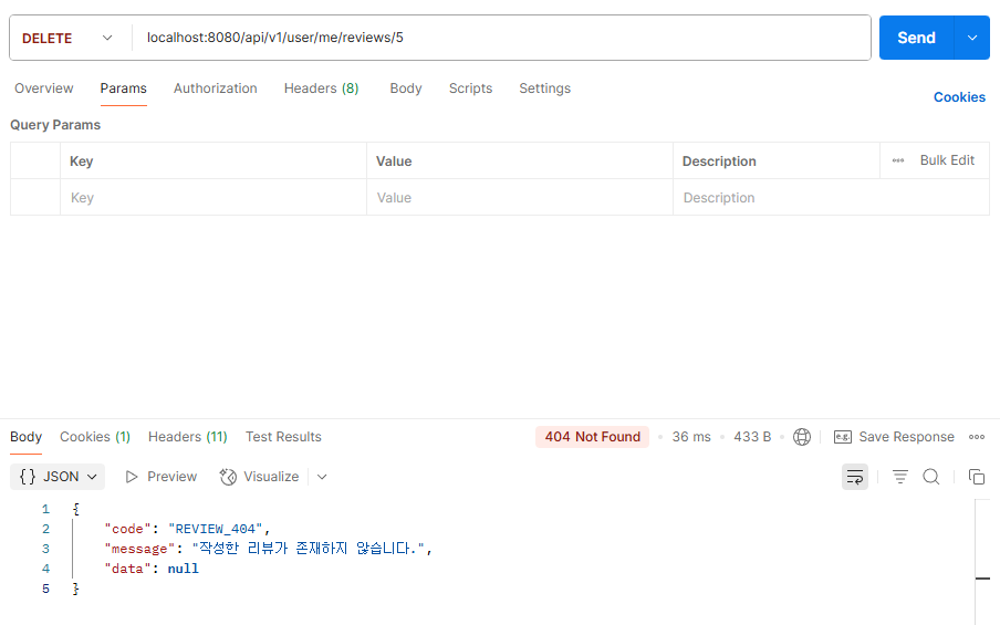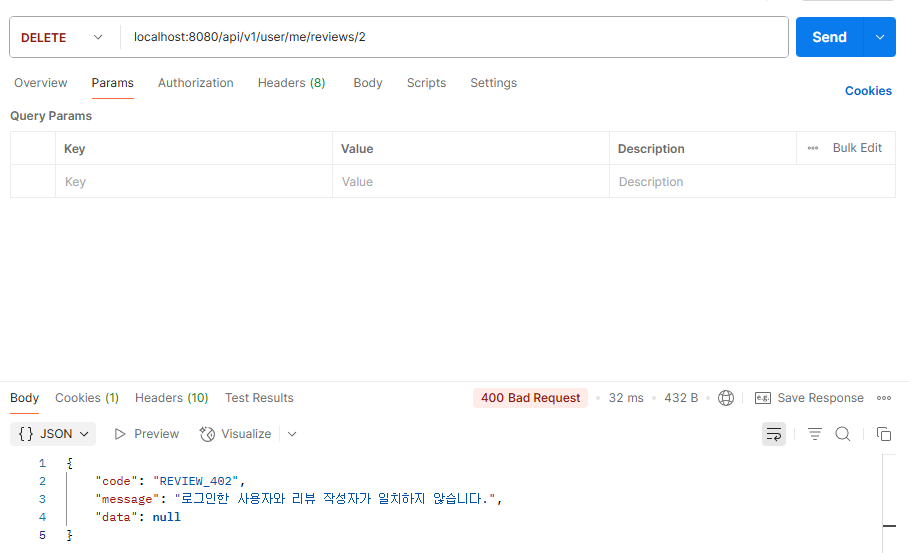 - DELETE /api/v1/user/me/reviews/{reviewId} 로 요청합니다.