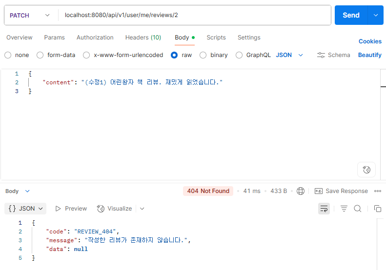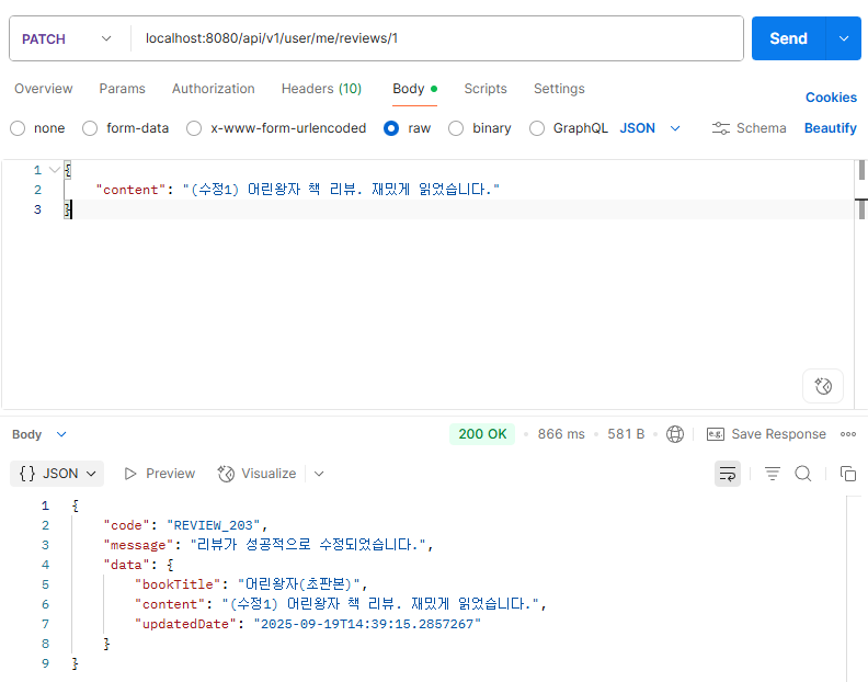 - 사용자 책 리뷰 수정 성공 코드 정의