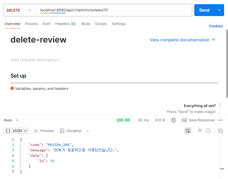 - DELETE /api/v1/admin/reviews/{reviewId}로 요청합니다