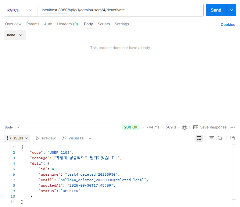 - PATCH /api/v1/admin/users/{userId}/deactivate 로 요청