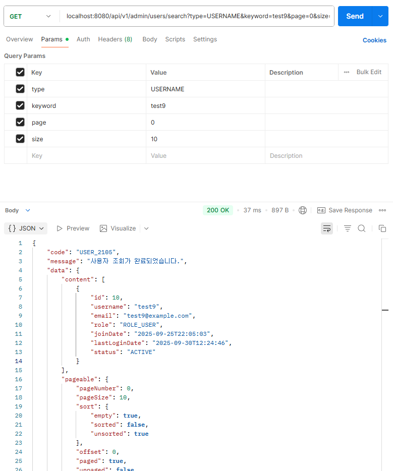 Page<AdminUserSearchResDTO> responseDTO = adminUserService.searchUser(type, keyword, page, size, user.getId());