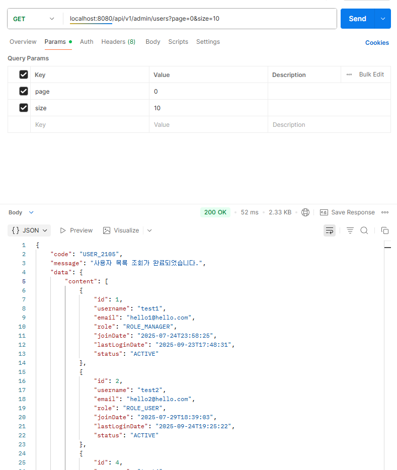 - userRepository.findAll(pageable)로 사용자 정보를 정의한 페이징 설정으로 조회하여 Page<User> 형태로 저장.