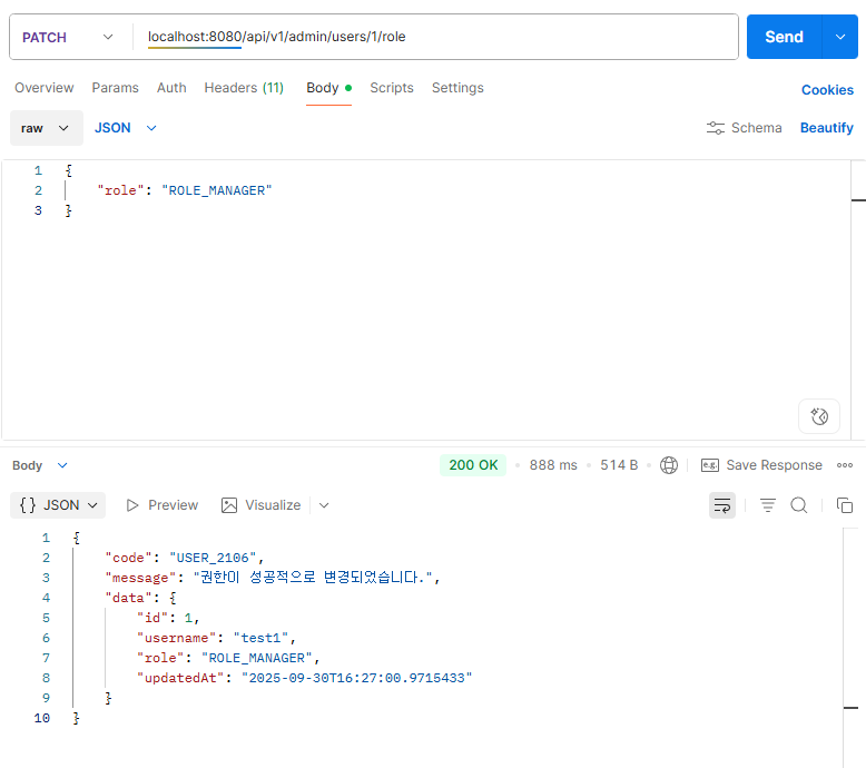 - PATCH /api/v1/admin/users/{userId}/role 로 요청