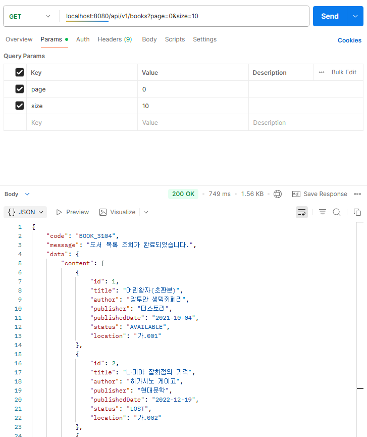 - bookRepository.findAll(pageable)로 설정된 페이징으로 도서 전체 목록을 조회하여 Page<Book> 형태로 저장.