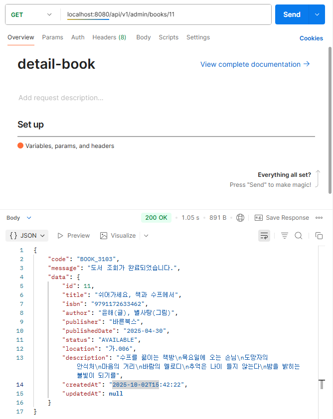 - Controller로 저장한 Book을 기반으로 AdminBookCreateResDTO 객체를 생성하여 반환한다.