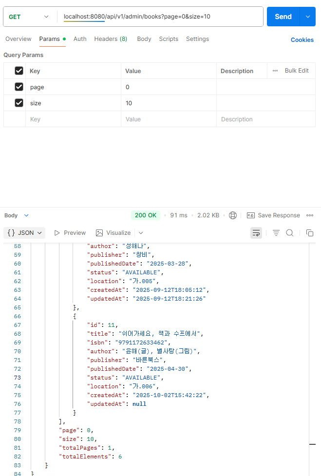 - 결과는 PageResponse<AdminBookSearchResDTO> 형태로 저장.