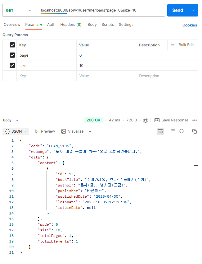 - loanRepository.findByUser_Id(user.getId(), pageable)를 사용하여 사용자 본인의 도서 대출 내역을 조회하여 페이징 처리한 데이터를 Page<Loan> result로 저장.