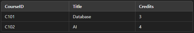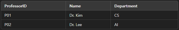 - 속성(Attribute): 학생(학번, 이름, 학년), 강의(강의번호, 제목, 학점), 교수(교수ID, 이름, 전공)
