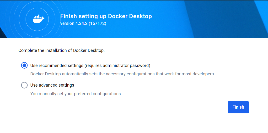 - Use recommended settings (requires administrator password) 가 선택 되어 있는지 확인하고 Finish 버튼 클릭