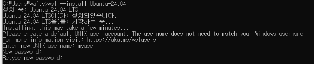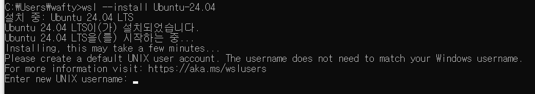 - wsl --install Ubuntu-24.04 명령어 입력 후 엔터