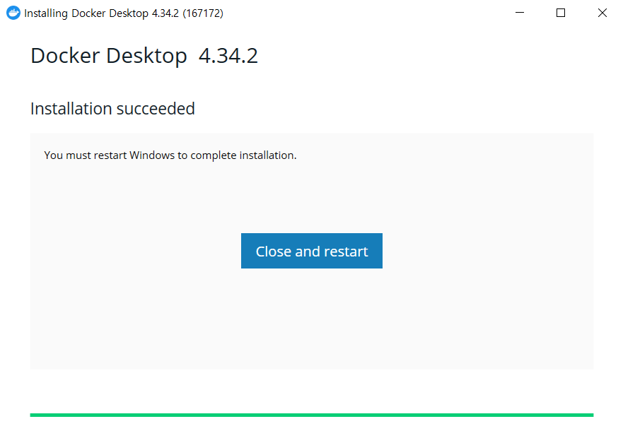 - 설치 완료되면 Close and restart 알림창이 뜨는데 버튼 클릭하면 됨. (자동 재부팅)
