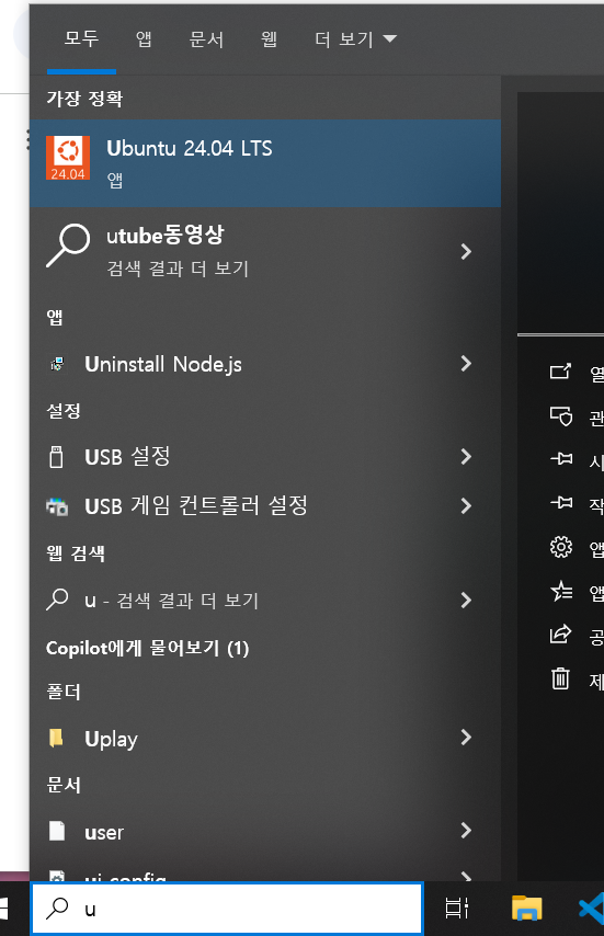 - 시작 버튼을 클릭하고 검색창에 U를 입력하면 Ubuntu 24.04 LTS가 보인다. (설치가 잘 됐다.)