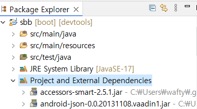 - Project and External Dependencies 안에 web, dvetools, thymeleaft 라이브러리가 있다.