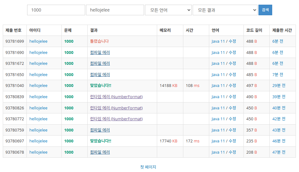 - 컴파일러 에러는 java.io.BufferedReader, java.io.ImportStreamReader, java.io.IOException을 import 안 시켜줘서 컴파일 에러가 떴다.