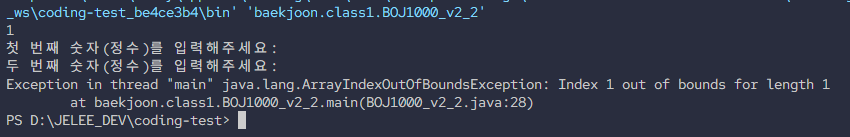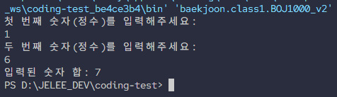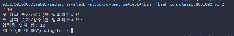 => 1 입력 > 엔터 > 2 입력 > 엔터 방식으로 하면 안된다. 2, 10 의 값을 따로 입력하는게 아니라 2 띄어쓰고 10 입력 > 엔터 이런 순으로 해야지 값이 각각 저장되고 합이 정상적으로 출력이 된다. 백준에서는 정상작동 된다.