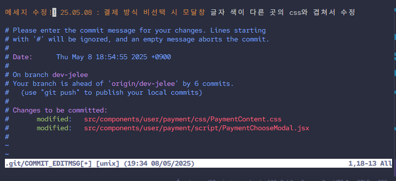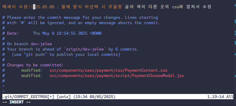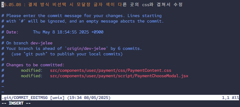 - 메세지 내용 수정 후 ESC 누르면 맨 아래에 -- INSERT -- 가 사라진 걸 볼 수 있다.