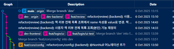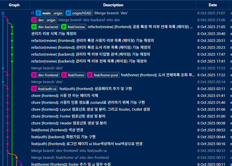 [ 작업한 내용 ]# Frontend1. 도서 검색 메뉴 생성- Header에 도서 검색 메뉴 생성2. 도서 전체 목록 조회- 도서 전체 목록을 페이지당 10개의 도서를 조회하여 보여줌3. 도서 검색- ALL, TITLE, AUTHOR 타입별 키워드로 조회- 검색 시 페이지당 10개의 도서 조회4. 도서 상세 페이지에서 목록으로 이동 시 이전 페이지로 이동- navigate(-1)이 아닌 세션으로 type, keyword, page, size를 저장하여 목록으로 이동 시 이전 기록 그대로 조회한 페이지로 이동- 단, keyword가 있는지 먼저 확인을 하여 키워드가 있으면 검색어 그대로 조회, 없으면 검색 후 도서 상세페이지로 이동한 것이 아니기 때문에 이전 페이지를 보여줌.